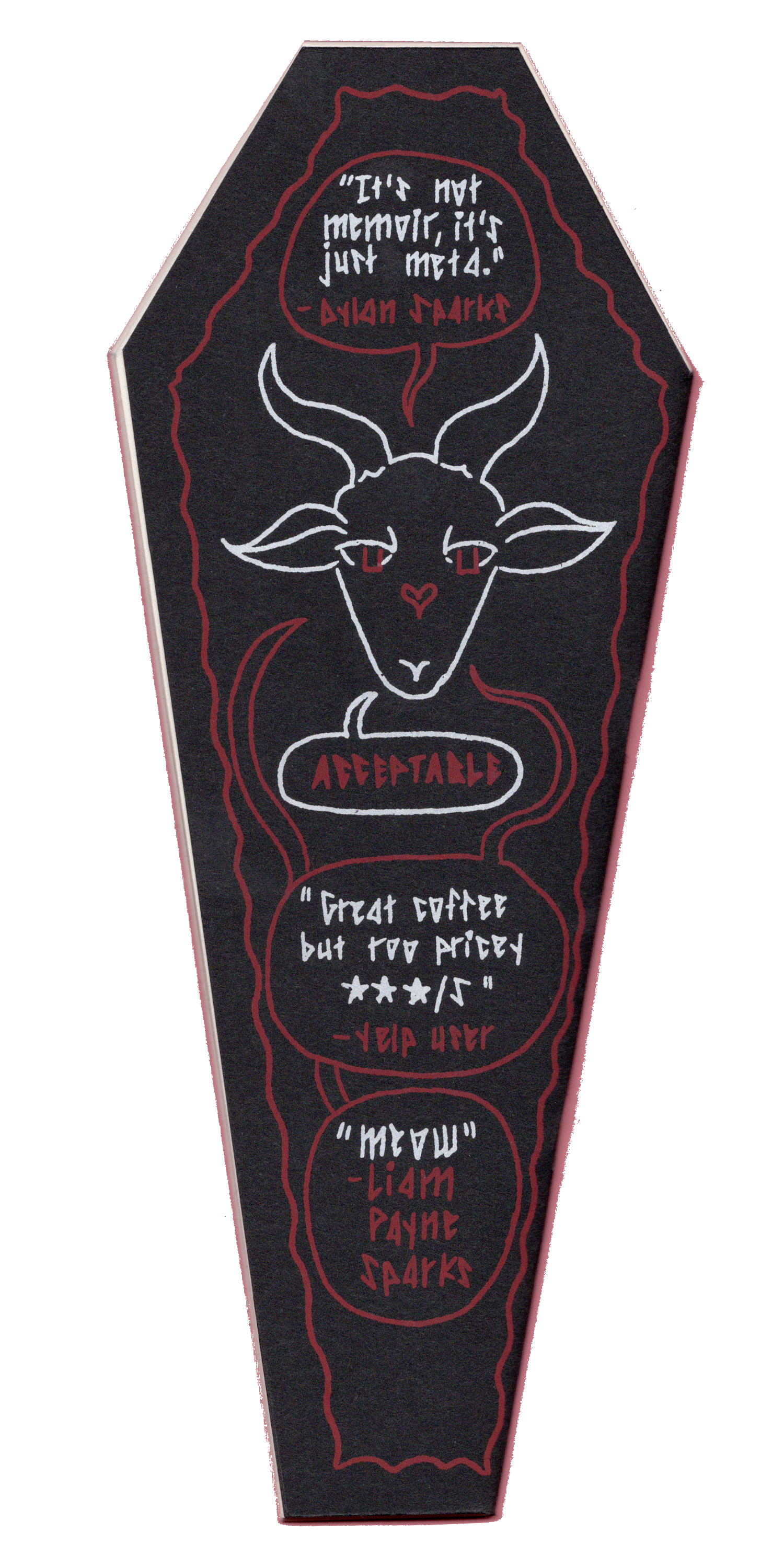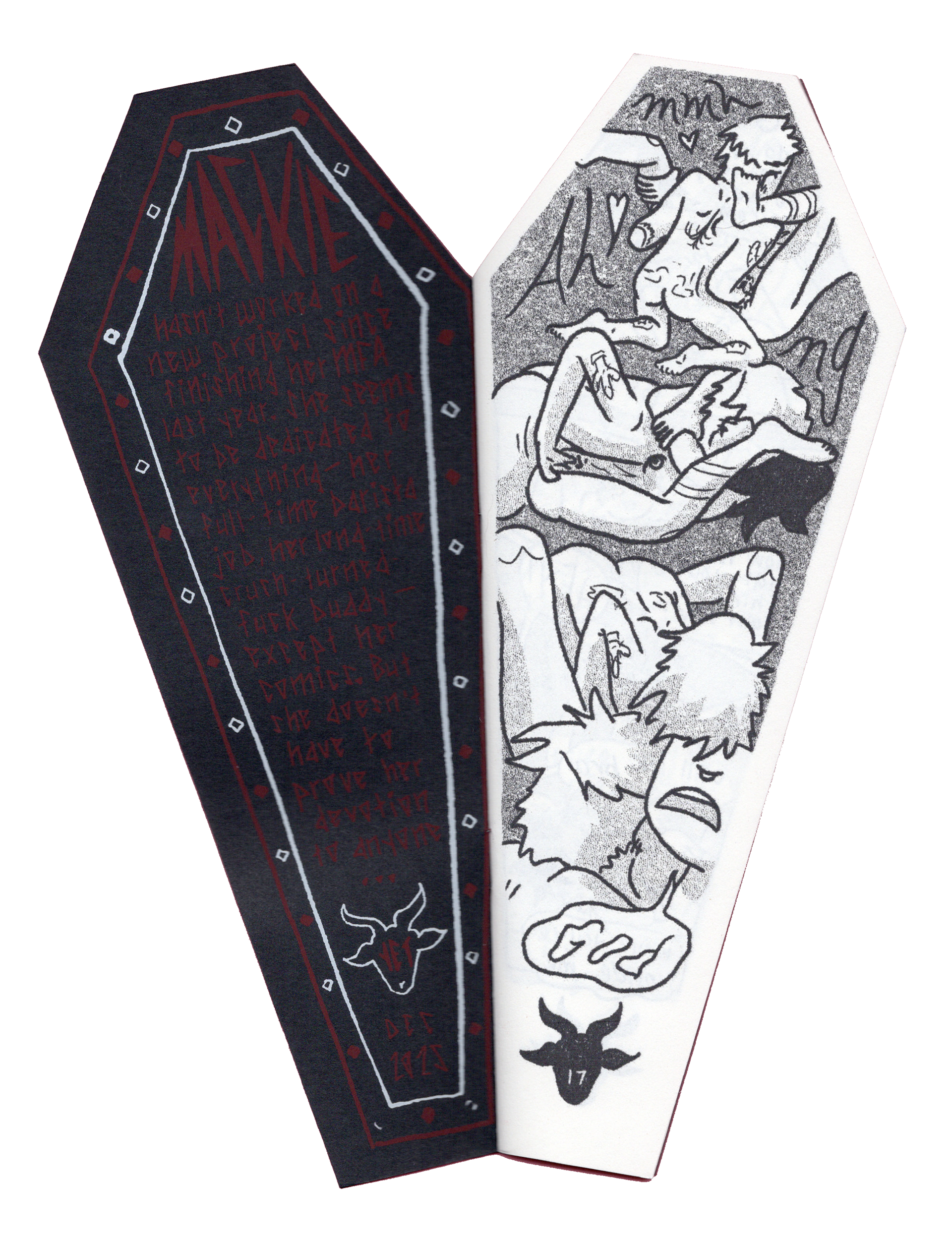 The physical edition includes a two-color screenprinted cover and is cut in the shape of a coffin.