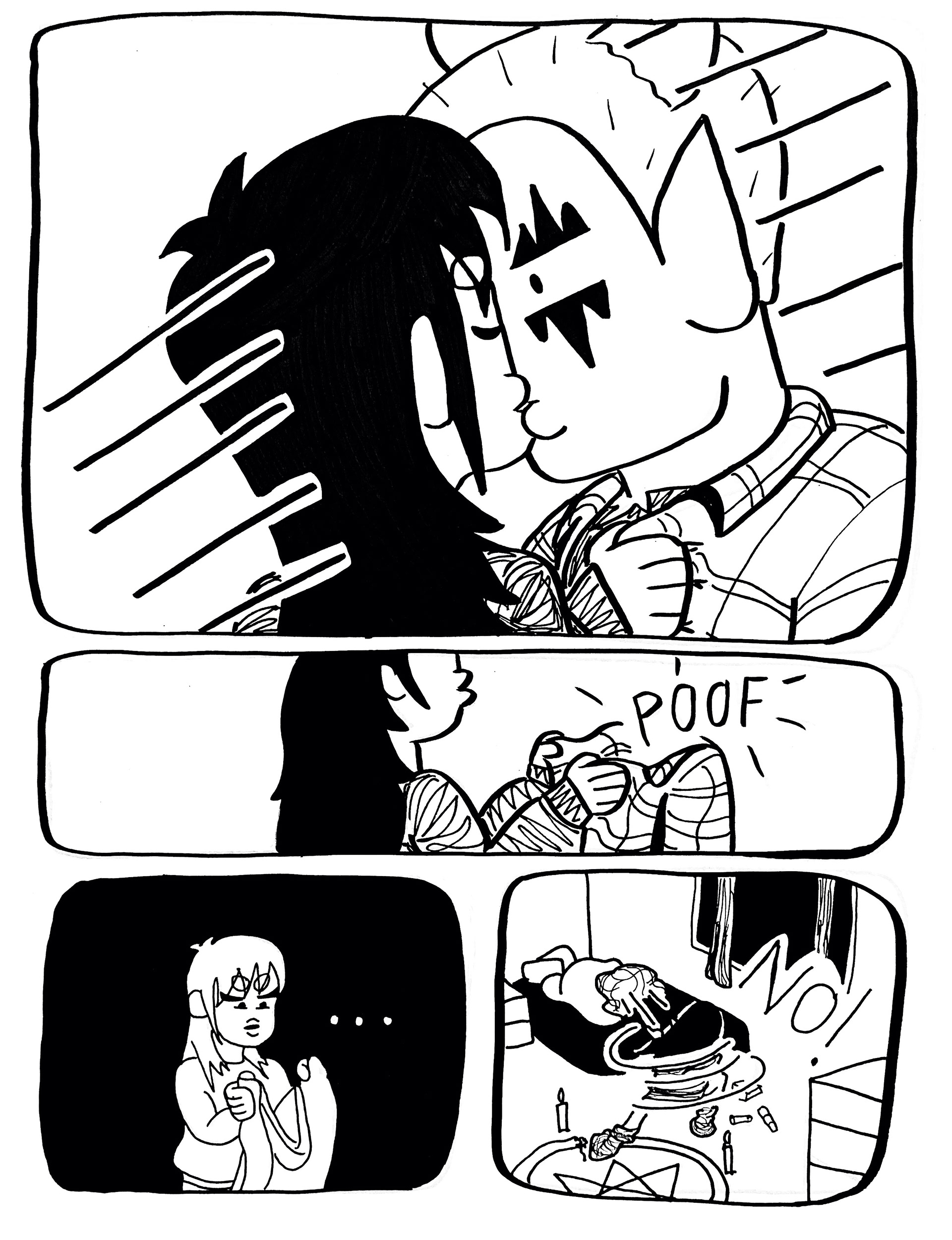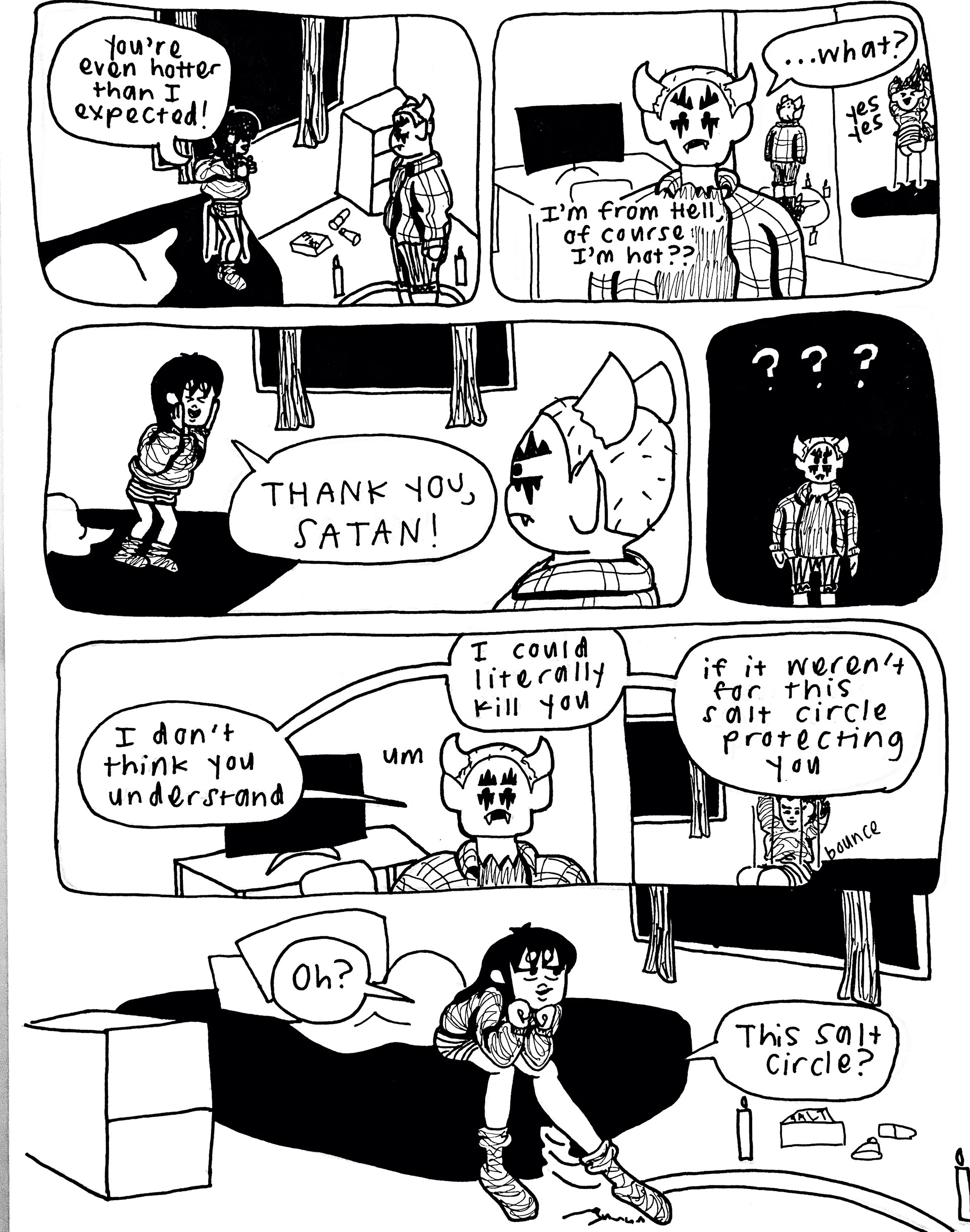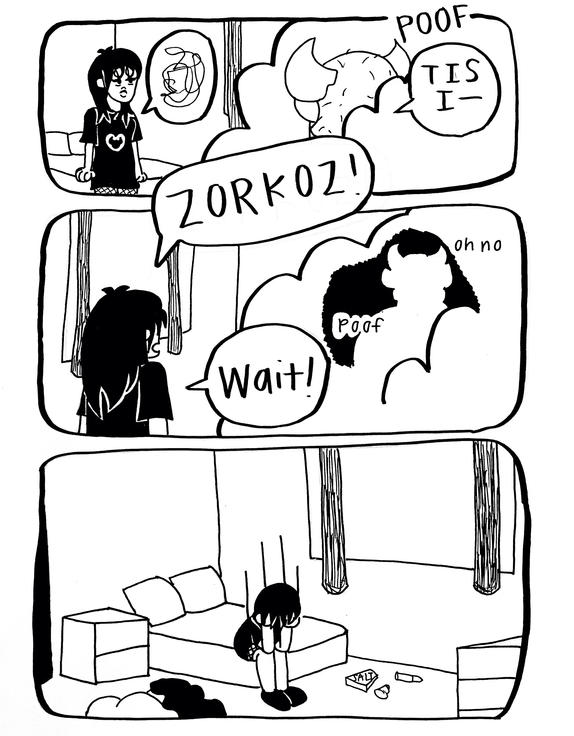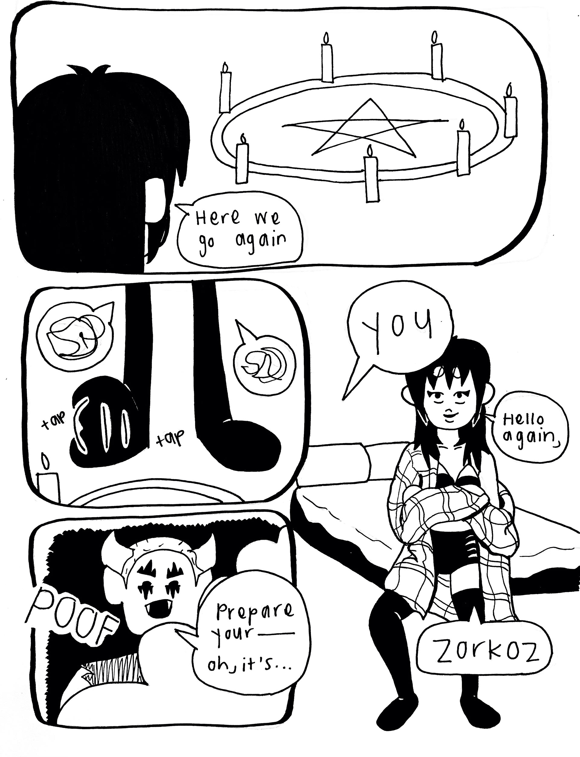 is a 15 page black and white romance comic about a human girl attempting to seduce the demon, Zorkoz, through summoning them into her bedroom.
