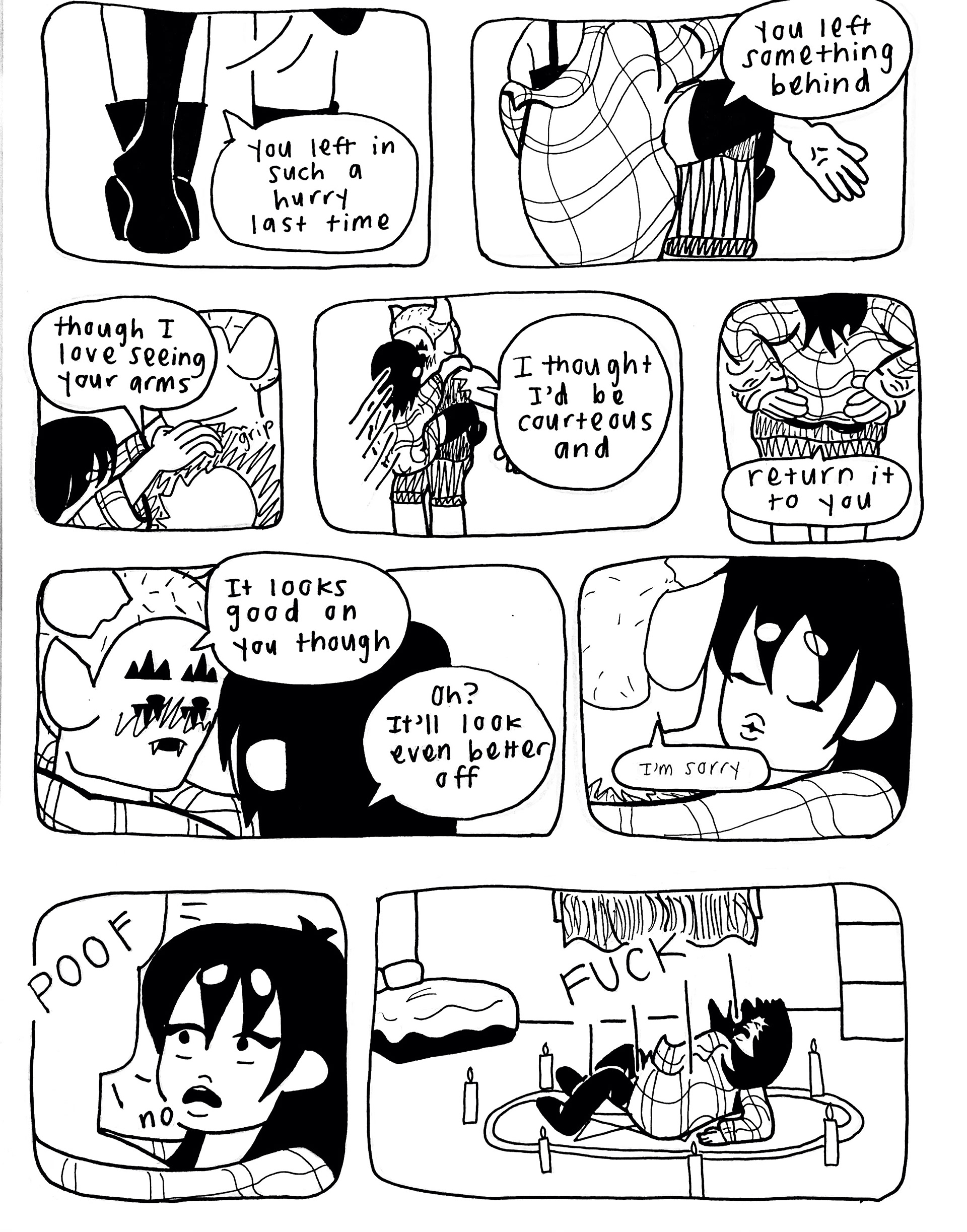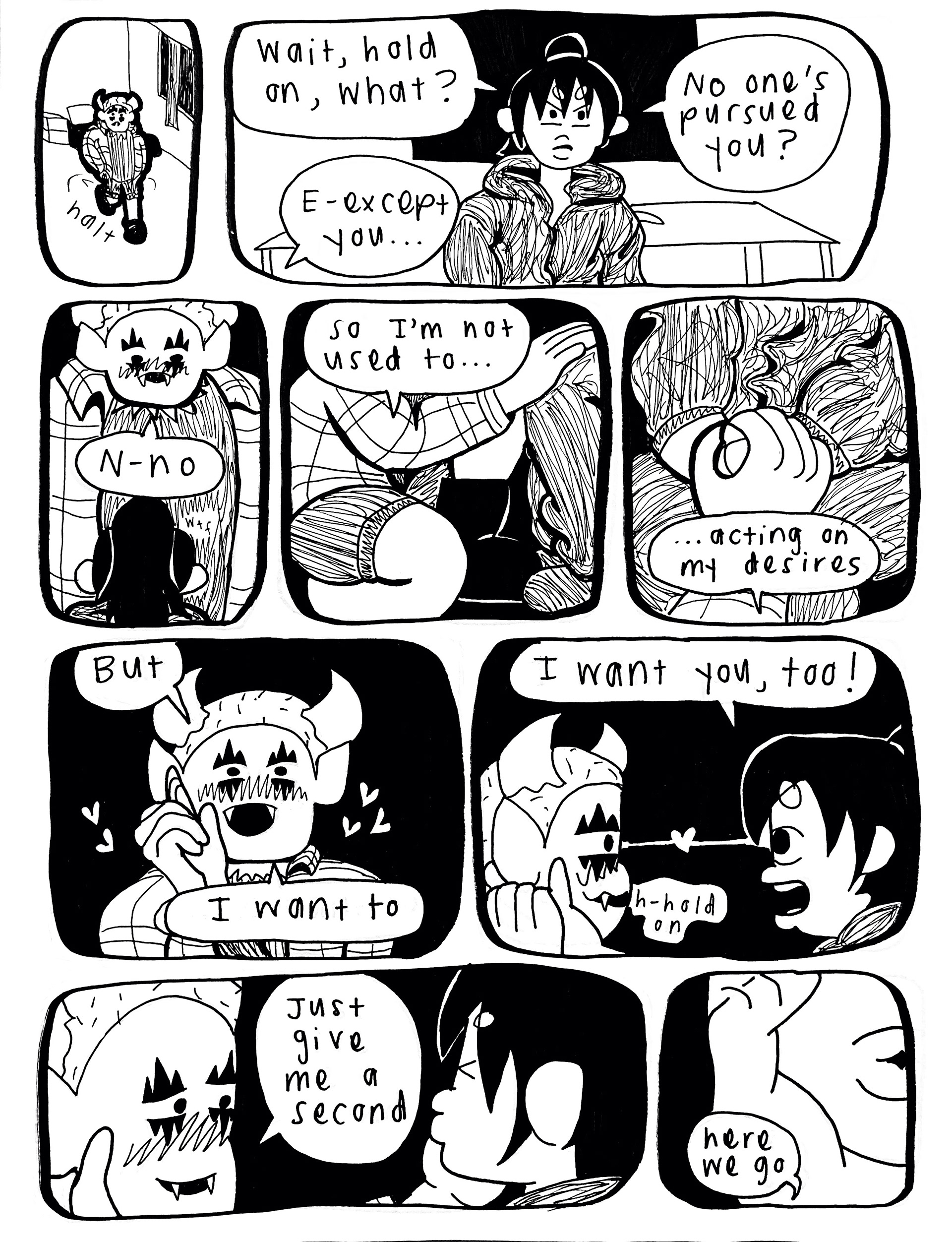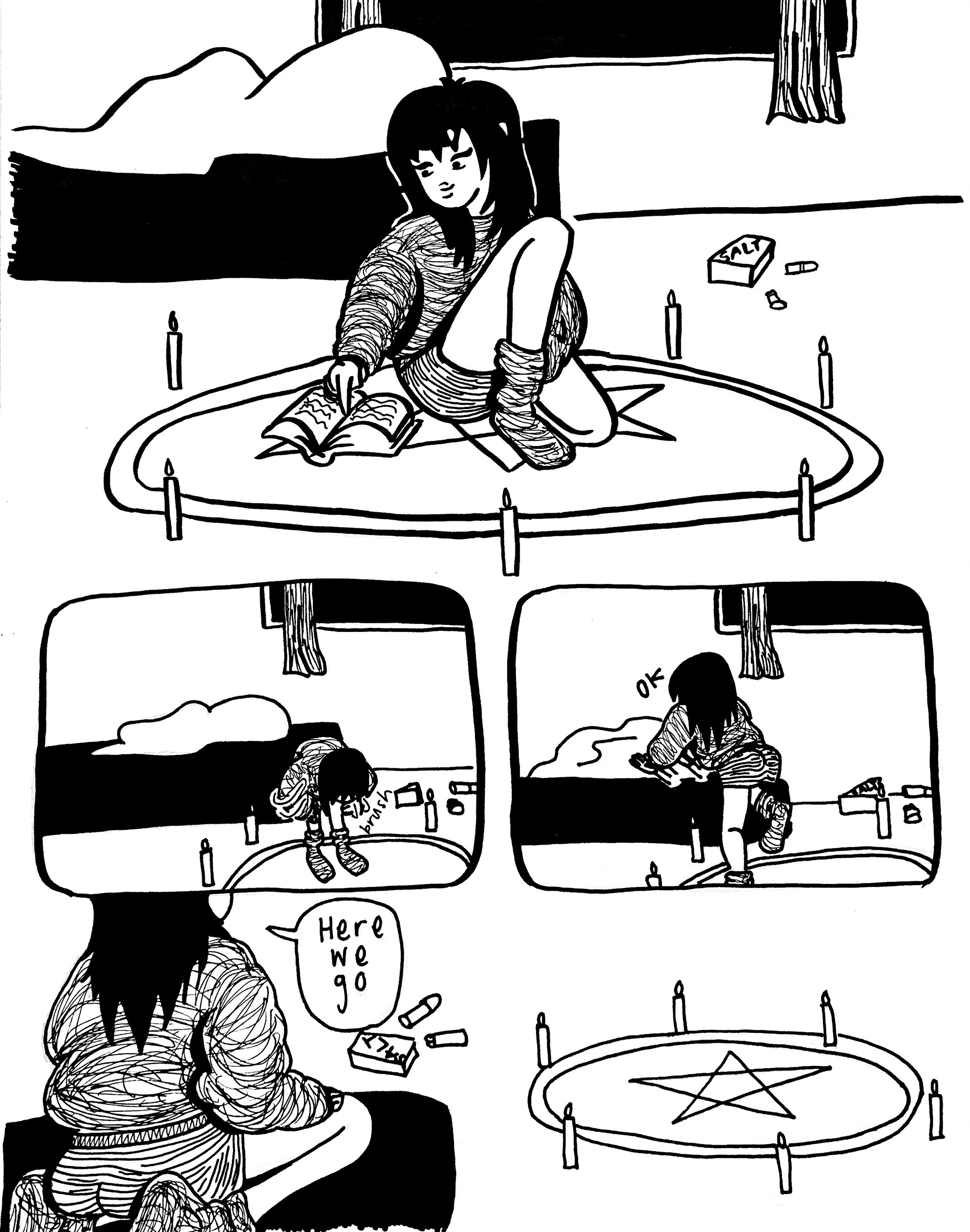 is a 15 page black and white romance comic about a human girl attempting to seduce the demon, Zorkoz, through summoning them into her bedroom.