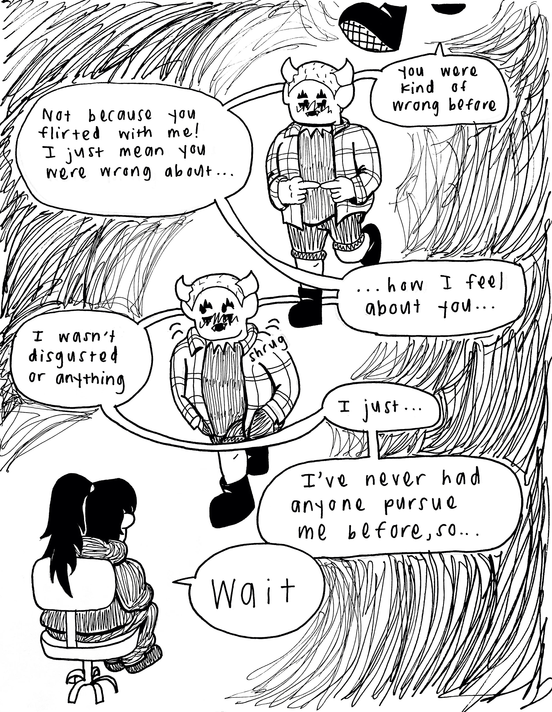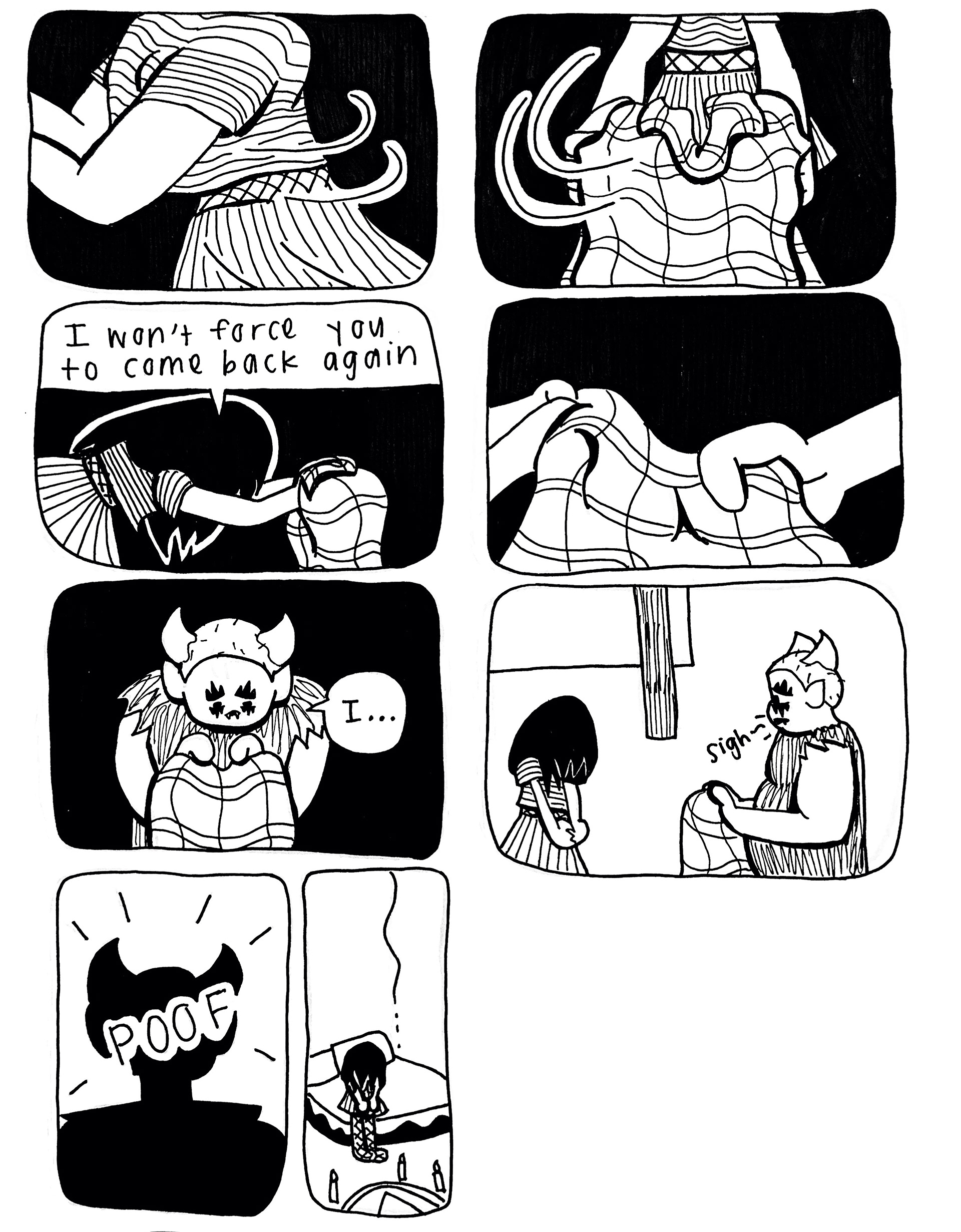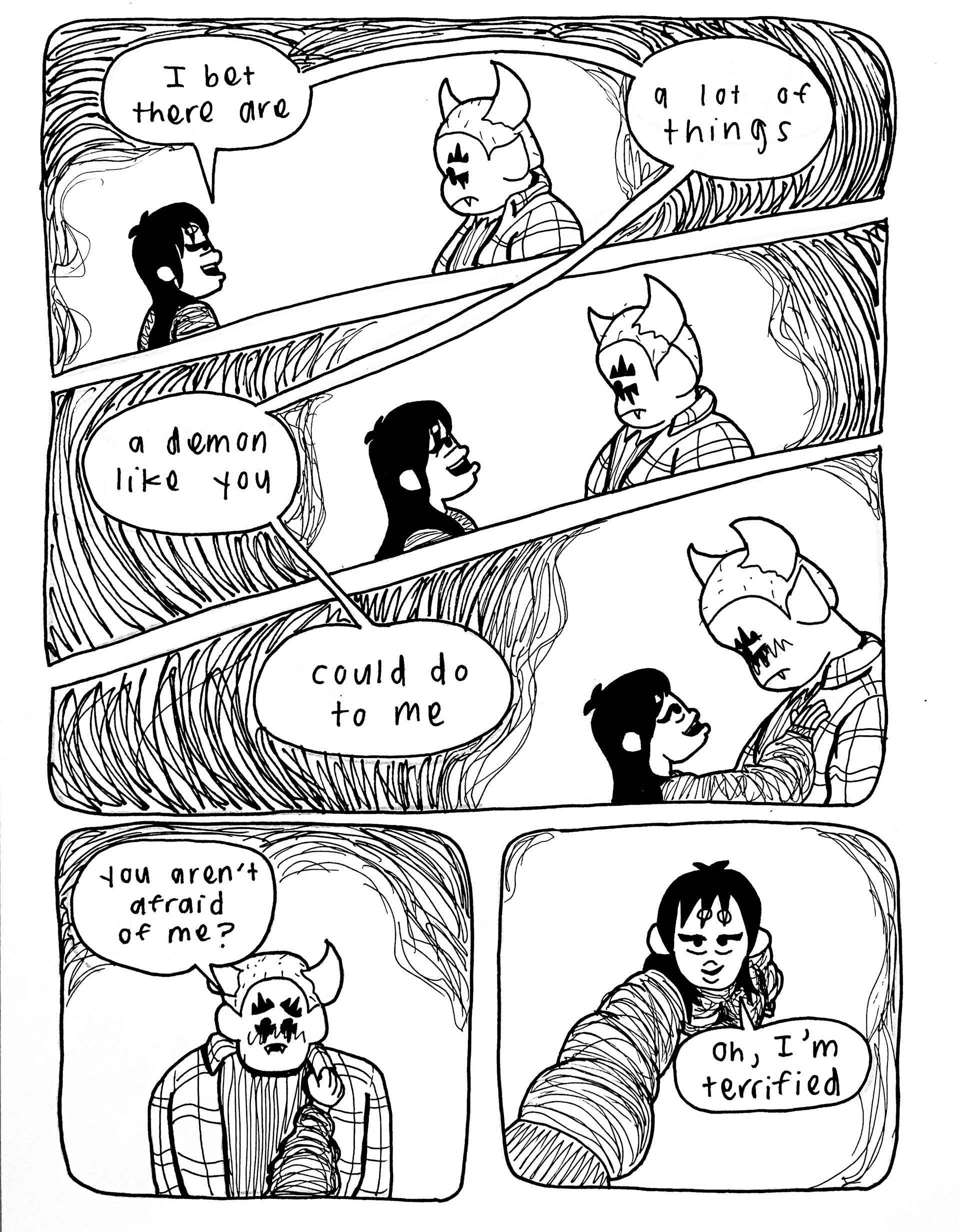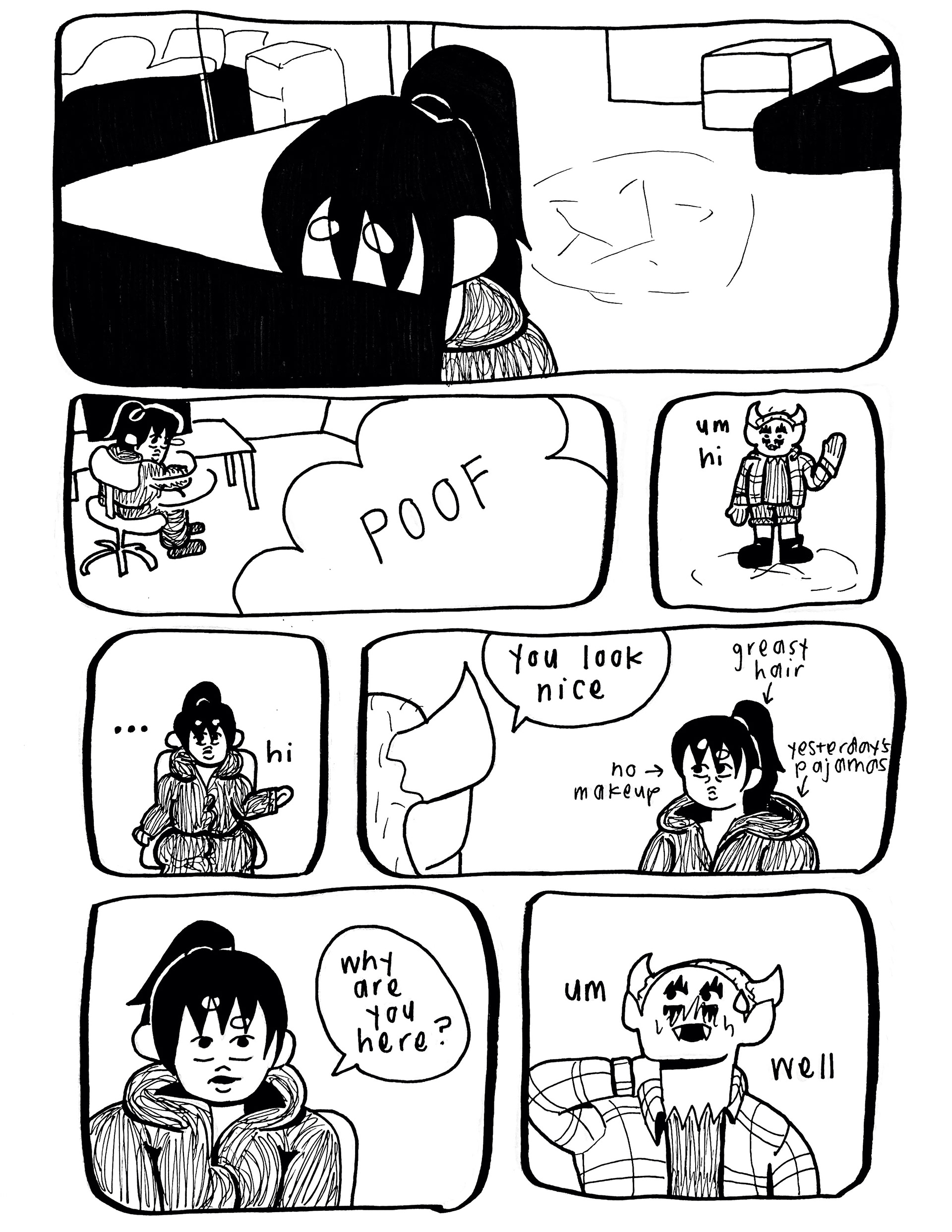 is a 15 page black and white romance comic about a human girl attempting to seduce the demon, Zorkoz, through summoning them into her bedroom.
